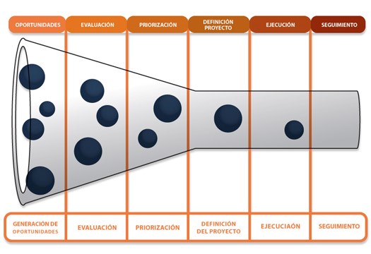 A ese “embudo” se le llama (en la jerga nuestra) “funnel de innovación”, y refleja cómo al principio entra en el proceso un número amplio de ideas que después van pasando por distintos filtros que sirven para descartar las menos válidas y madurar a las mejores. En cada etapa o momento del embudo, mientras más se avanza hacia la derecha, más progresan los proyectos hasta que después de superar todos los filtros, se convierten en una innovación real con impacto.