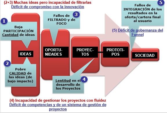 Visto el funnel desde una perspectiva más transversal, podríamos decir que en la gestión de los procesos de innovación (tanto públicos como privados) tenemos tres grandes retos, que tienen una naturaleza bastante diferente. Son tres fases en las que podríamos dividir el embudo que venimos describiendo: